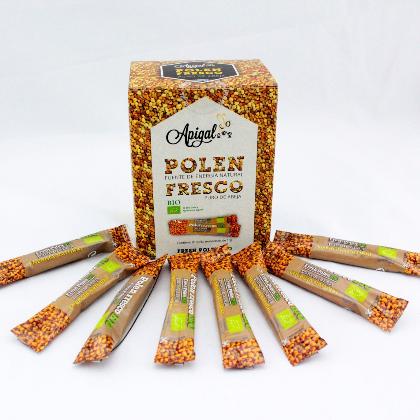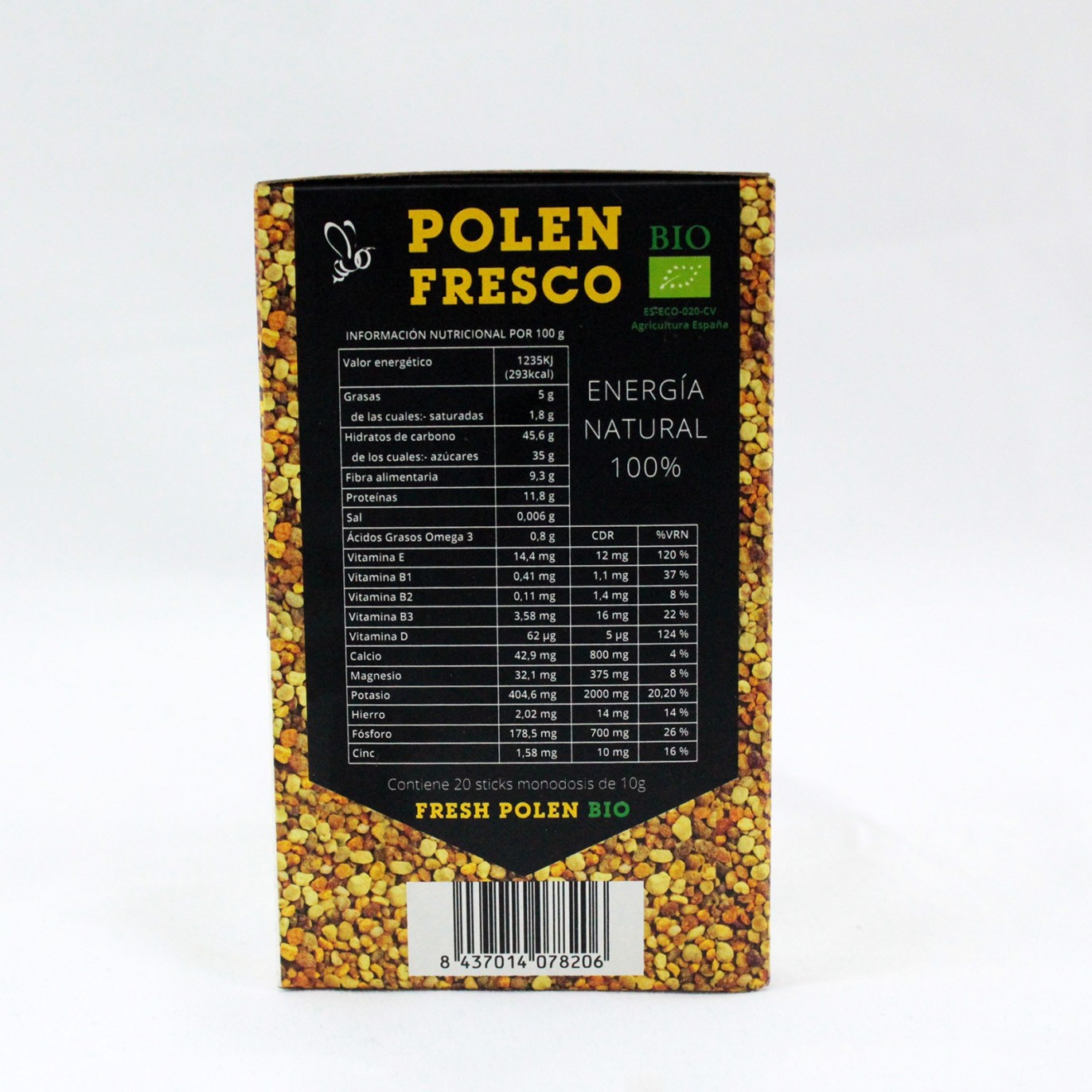 Polen fresco ecológico, recién recolectado, sin procesos, ni secado, envasado en atmósfera protectora para conservar mejor sus propiedades y fresco para conservar todo su sabor y textura. Se sirve en sticks unidosis.